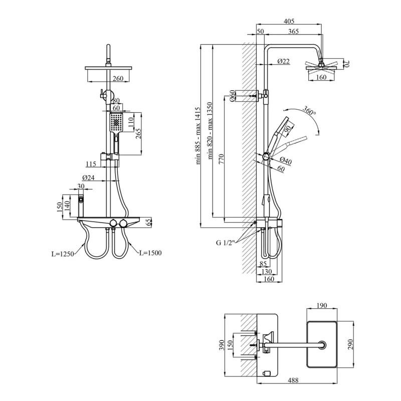 Душевая система имеет компактные размеры, что позволяет легко интегрировать ее в любой интерьер ванной: высота – от 885 до 1415 мм, ширина – 390 мм, глубина – 488 мм.