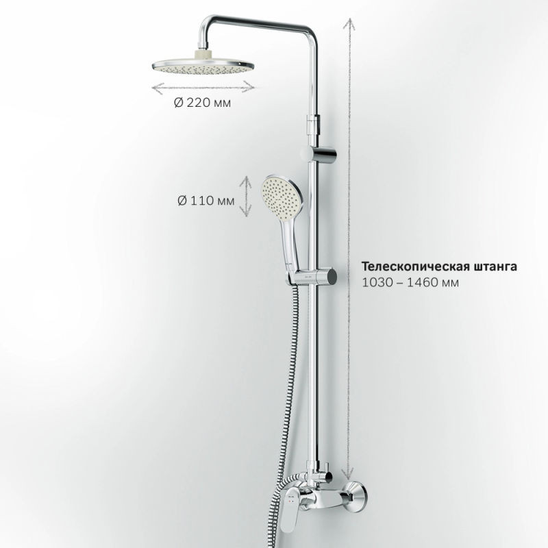 Диаметр душевых леек (верхний душ 220 мм и ручной душ 110 мм) позволит ощутить преимущества тропического душа даже в стандартной ванной, тогда как увеличенная длина шланга 1750 мм обеспечит свободу движений во время принятия душа. Продуманные детали для удобства использования: телескопическая поворотная штанга регулируется по высоте в диапазоне от 1030 до 1460 мм, обеспечивая комфорт для людей любого роста.