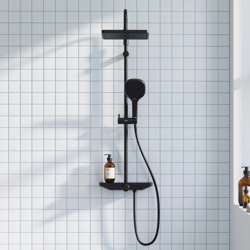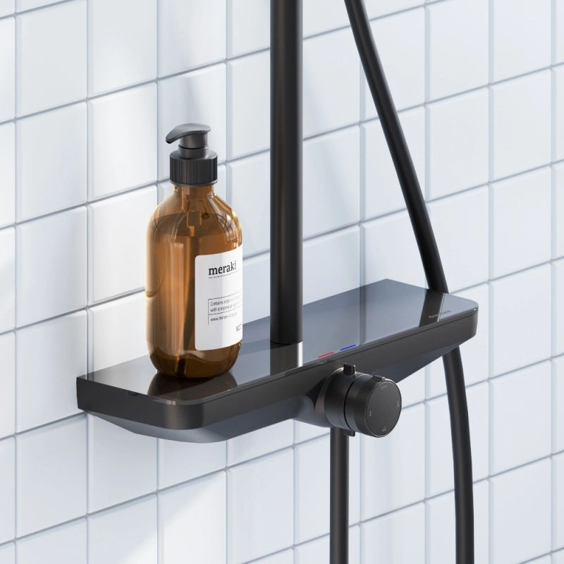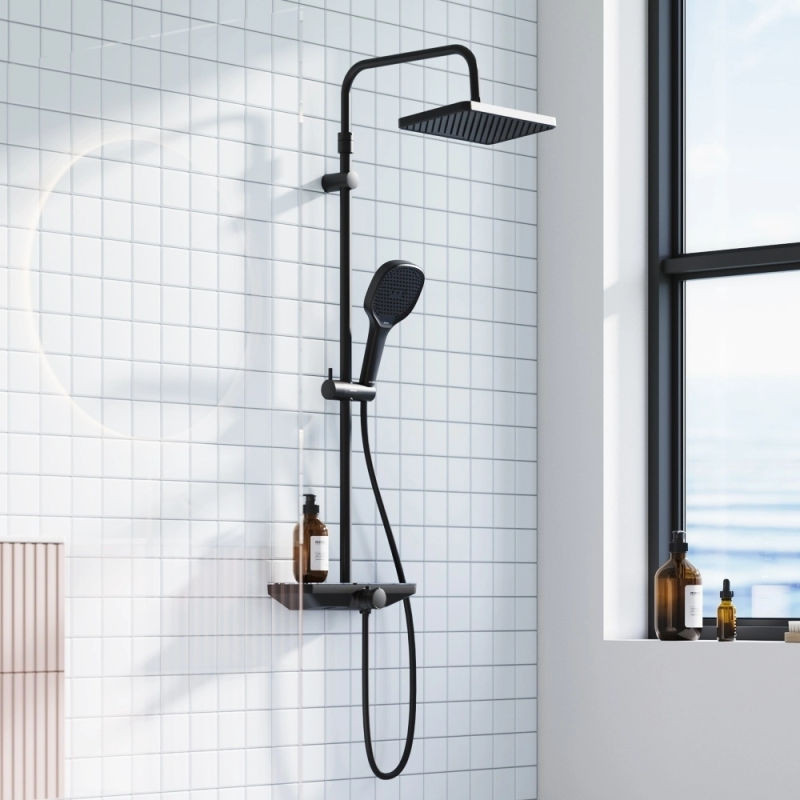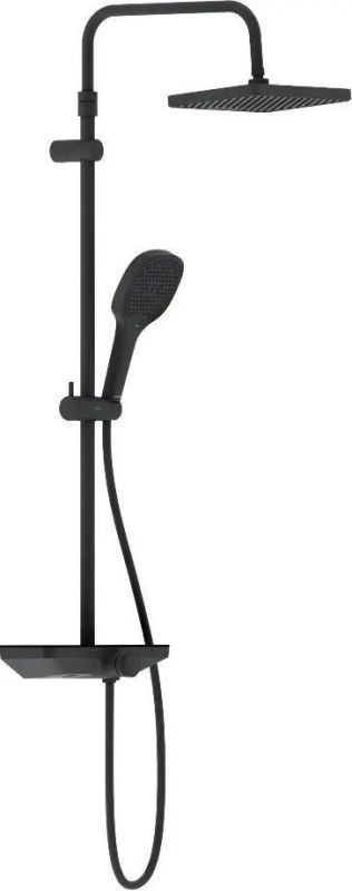 Душевая система DAMIXA Merkur с верхним душем и изливом латунная черная с ванно-душевым смесителем-полкой и прогрессивным картриджем 940730300