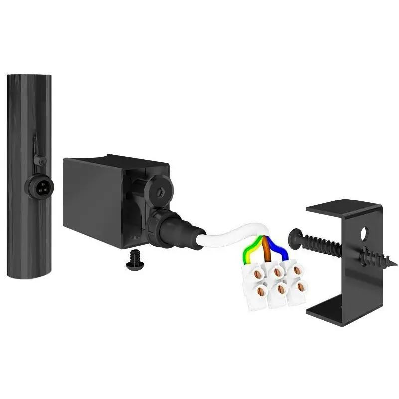 Модуль скрытого подключения устанавливается позади стойки где находится регулятором температуры или выключатель, фиксируется при помощи болтов и саморезов поставляемых в комплекте. Кабель питания с вилкой отрезается, подключается через клеммную колодку к скрытому проводу питания (под шпаклёвкой или облицовкой) предварительно уложенному к месту установки полотенцесушителя.