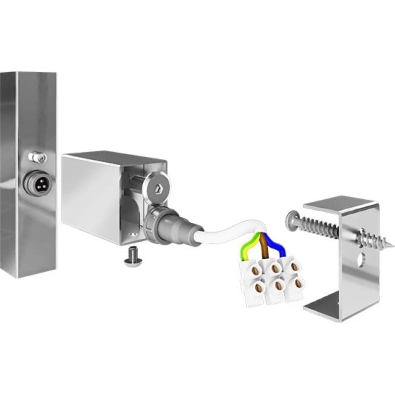 Модуль скрытого подключения устанавливается позади стойки где находится регулятором температуры или выключатель, фиксируется при помощи болтов и саморезов поставляемых в комплекте. Кабель питания с вилкой отрезается, подключается через клеммную колодку к скрытому проводу питания (под шпаклёвкой или облицовкой) предварительно уложенному к месту установки полотенцесушителя.