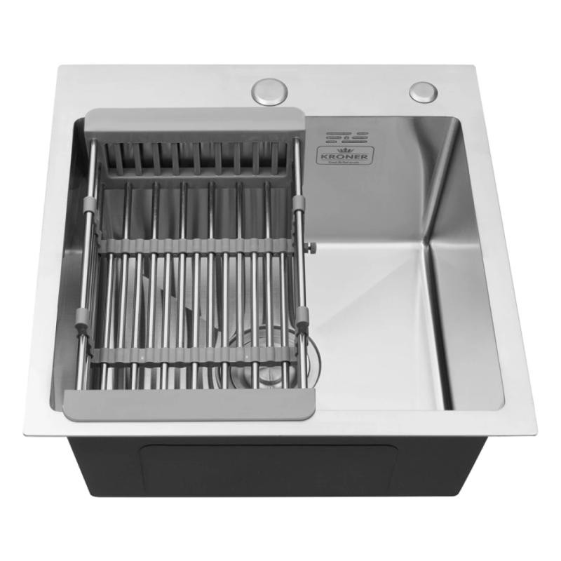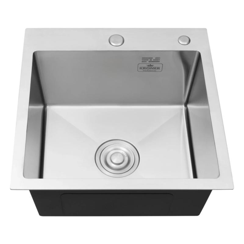 Кухонна мийка Kroner KRP Gebürstet - 4545HM — це поєднання сучасного дизайну та високої якості матеріалів. Виготовлена з нержавіючої сталі, мийка має товщину матеріалу 3 мм у верхній частині та 1 мм у стінках, що забезпечує стійкість до зносу і довговічність. Її брашована поверхня надає елегантного матового вигляду, що добре доповнює будь-який інтер'єр кухні.