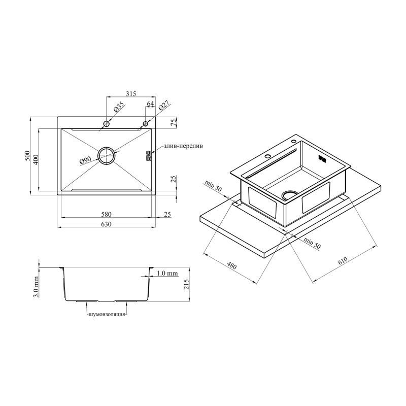 Шумоизоляция и антиконденсат: Мытье полностью покрыто шумоизоляцией и антиконденсатом, что снижает шум при использовании и предотвращает образование конденсата.
