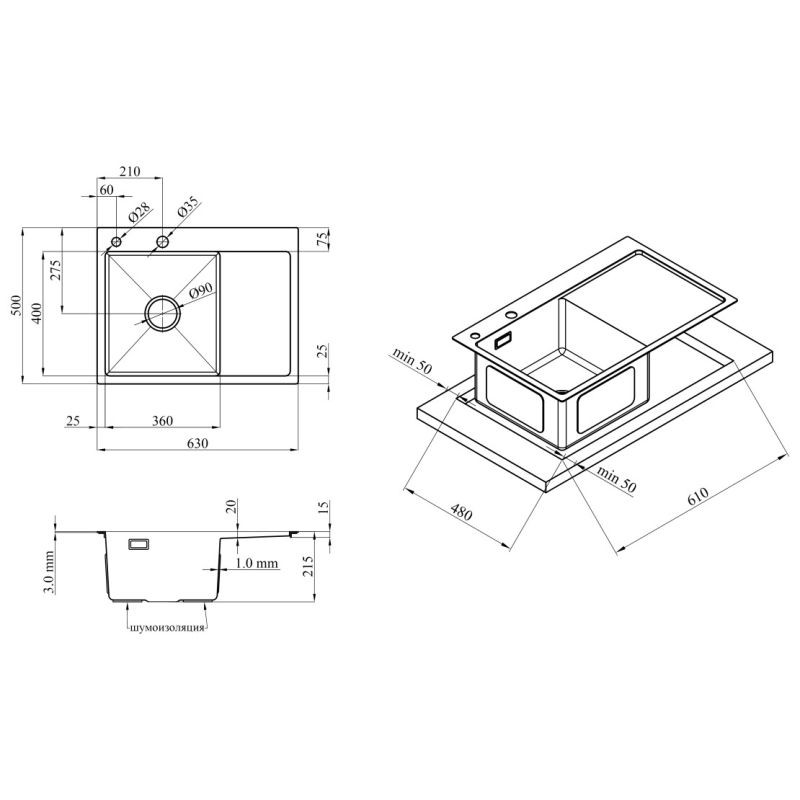Кухонная мойка Kroner KRP Schwarze - 6350LHM PVD (3,0/1,0 мм) (CV031322) характеристики: