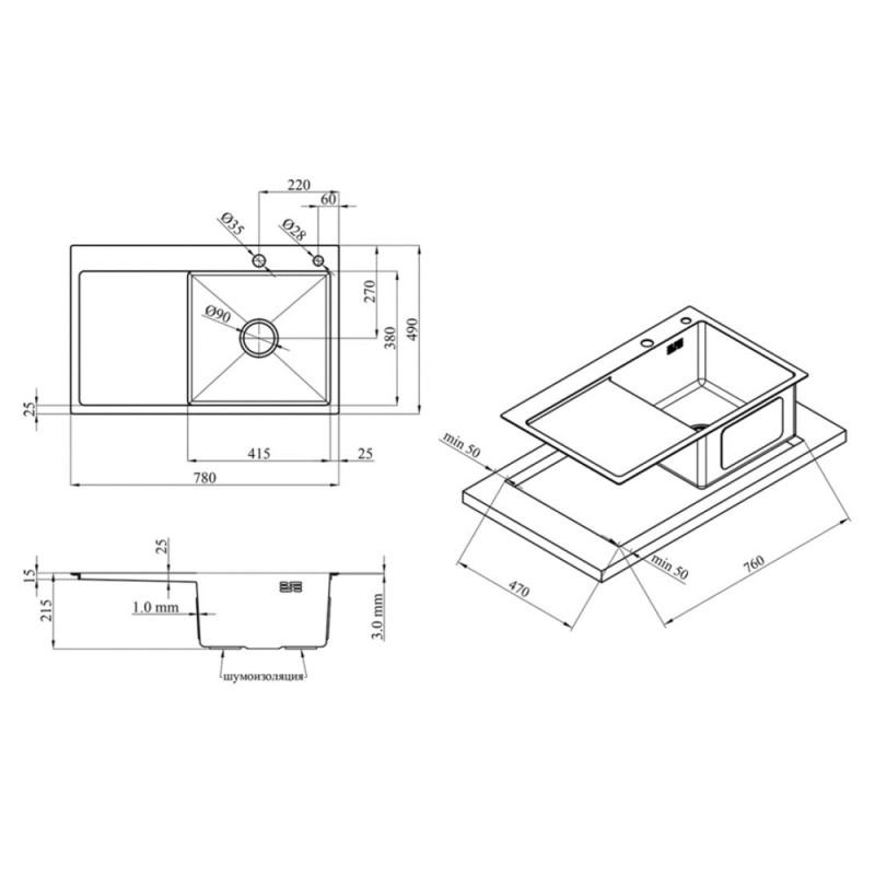 Кухонная мойка Lidz Handmade H7849BL крыло слева (LDH6545BPVD43623) Brushed Black PVD 3,0/1,0 мм характеристики: