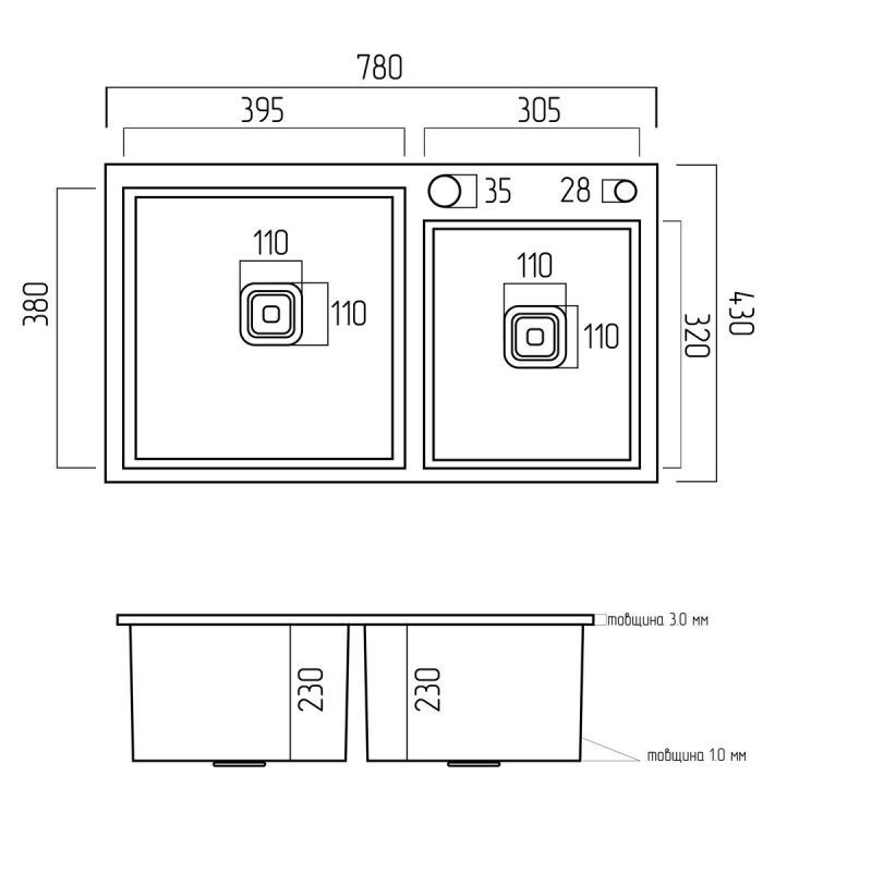 Кухонная мойка Platinum Handmade 78*43 это отличное стильное решение для кухни средних и больших размеров. Современный дизайн прямоугольной формы хорошо подходит разным интерьерам кухни. Дополнительная чаша и сушка обеспечит удобное повседневное использование мойки.
