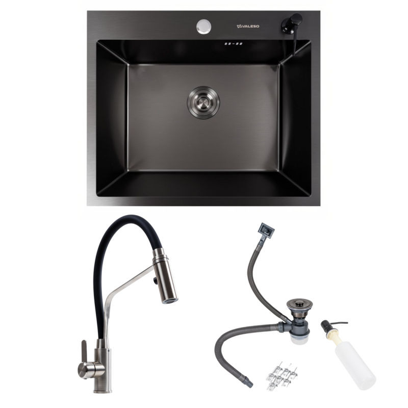 Кухонная мойка VALESO Handmade 60*50 PVD черная + Смеситель KN36