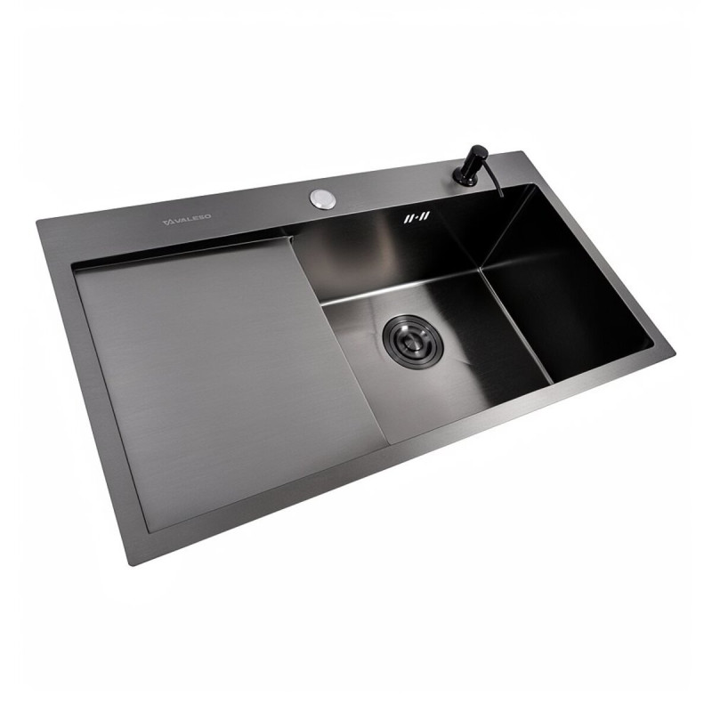 Кухонная мойка VALESO CM 78*43 L PVD Black – это премиальное сочетание стиля и высоких технологий. Модель выполнена в глубоком черном цвете благодаря PVD-покрытию, защищающему металл от царапин, коррозии и выцветанию. Технология Handmade гарантирует идеальную геометрию и повышенную прочность конструкции.
