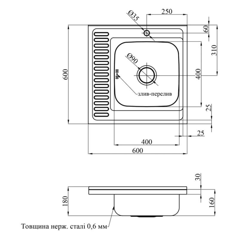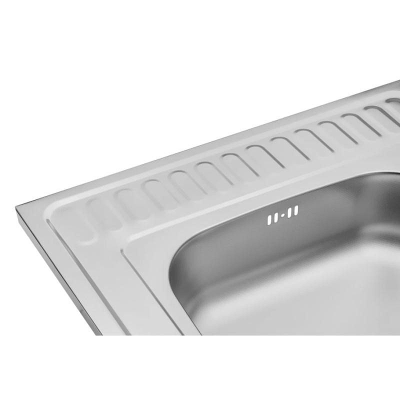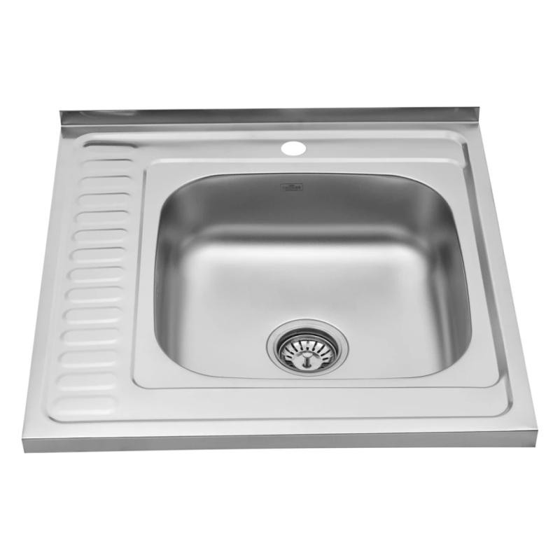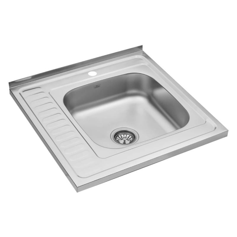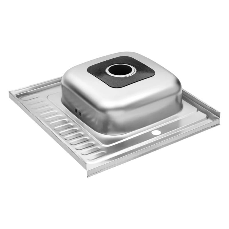 размером 60х60 см изготовлена из нержавеющей стали толщиной 0,6 мм. Мойка накладная на тумбу или столешницу, оснащена специальным бортом под стену. Крыло со стоками для воды размещено слева от чаши. На борту мойки предусмотрено одно отверстие для смесителя. Благодаря глубине в 16 см и просторным размерам чаши вы легко сможете мыть в ней крупную посуду или набирать воду в высокие кастрюли. Прекрасное рельефное покрытие не впитывает запахи, устойчиво к механическим повреждениям и легко моется.