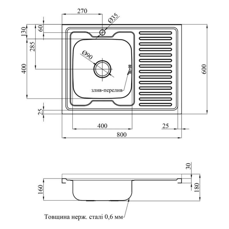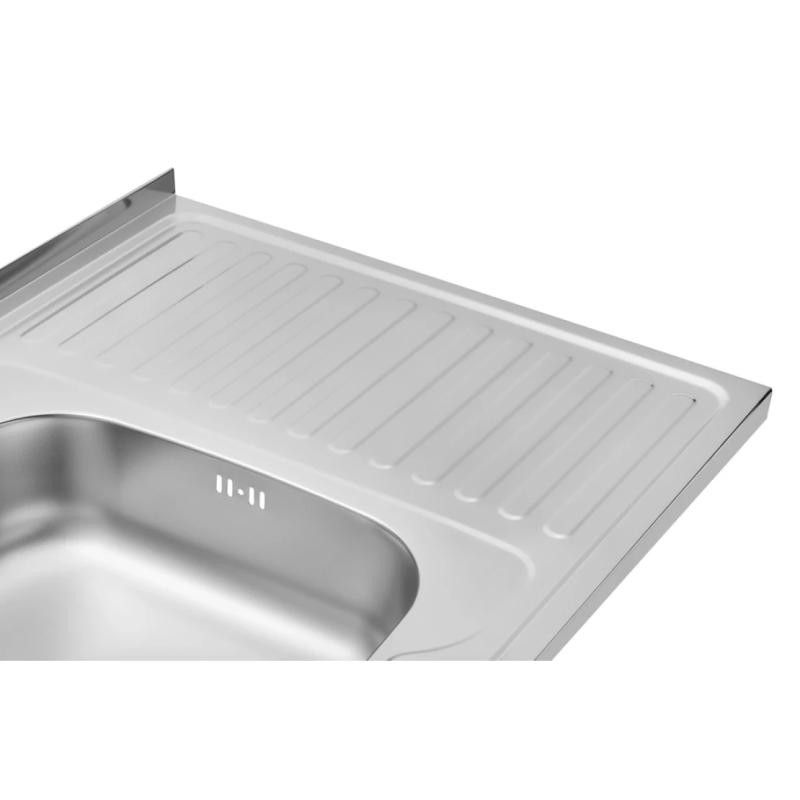 размером 60х80 см изготовлена из нержавеющей стали толщиной 0,6 мм. Мойка накладная на тумбу или столешницу, оснащена специальным бортом под стену. Крыло со стоками для воды размещено справа от чаши. На борту мойки предусмотрено одно отверстие для смесителя. Благодаря глубине в 16 см и просторным размерам чаши вы легко сможете мыть в ней крупную посуду или набирать воду в высокие кастрюли. Прекрасное рельефное покрытие не впитывает запахи, устойчиво к механическим повреждениям и легко моется.
