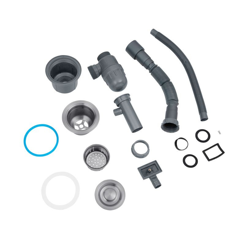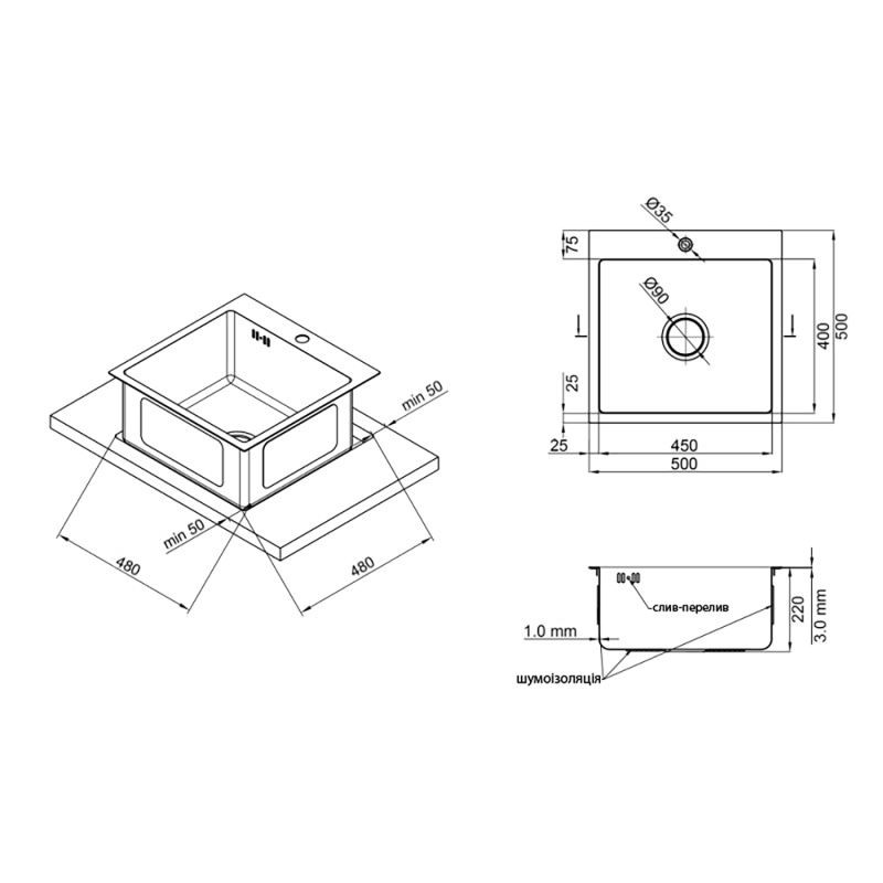 имеет квадратную форму с размерами 50х50 см и матовую поверхность. В мойке предусмотрено отверстие для смесителя. Мойку можно устанавливать несколькими способами: на столешницу, в один уровень со столешницей и под столешницу. Дно мойки имеет углубление к сливу в виде граней, что обеспечивает полное стекание и меньшее образование пятен от высохшей воды. На внешней стороне мойка имеет специальное звукоизолирующее покрытие, которое минимизирует шумы от струи воды. Мойка укомплектована сифоном с корзинчатым сливом и донным клапаном оригинальной формы.