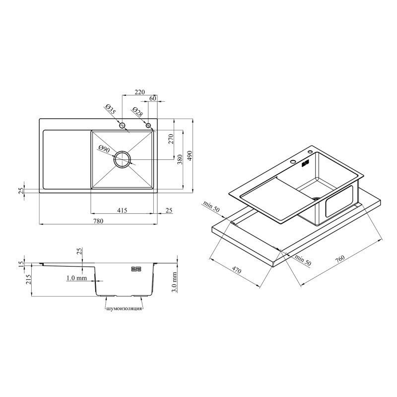 имеет прямоугольную форму с размерами 78х49 см и матовую поверхность. Большая просторная чаша скомбинирована с крылом на котором можно сушить посуду. Чаша размещена справа и над ней предусмотрены отверстия для смесителя и дозатора моющего средства. Мойку можно устанавливать несколькими способами: на столешницу, в один уровень со столешницей и под столешницу. Дно мойки имеет углубление к сливу в виде граней, что обеспечивает полное стекание и меньшее образование пятен от высохшей воды. На внешней стороне мойка имеет специальное звукоизолирующее покрытие, которое минимизирует шумы от струи воды. Мойка укомплектована сифоном с корзинчатым сливом и донным клапаном оригинальной формы.