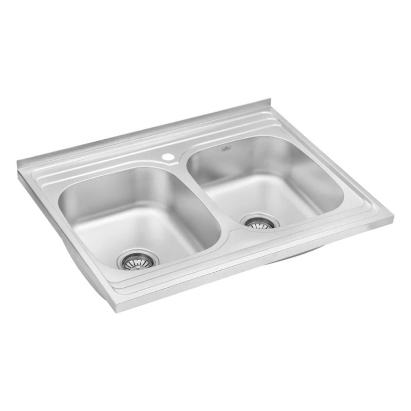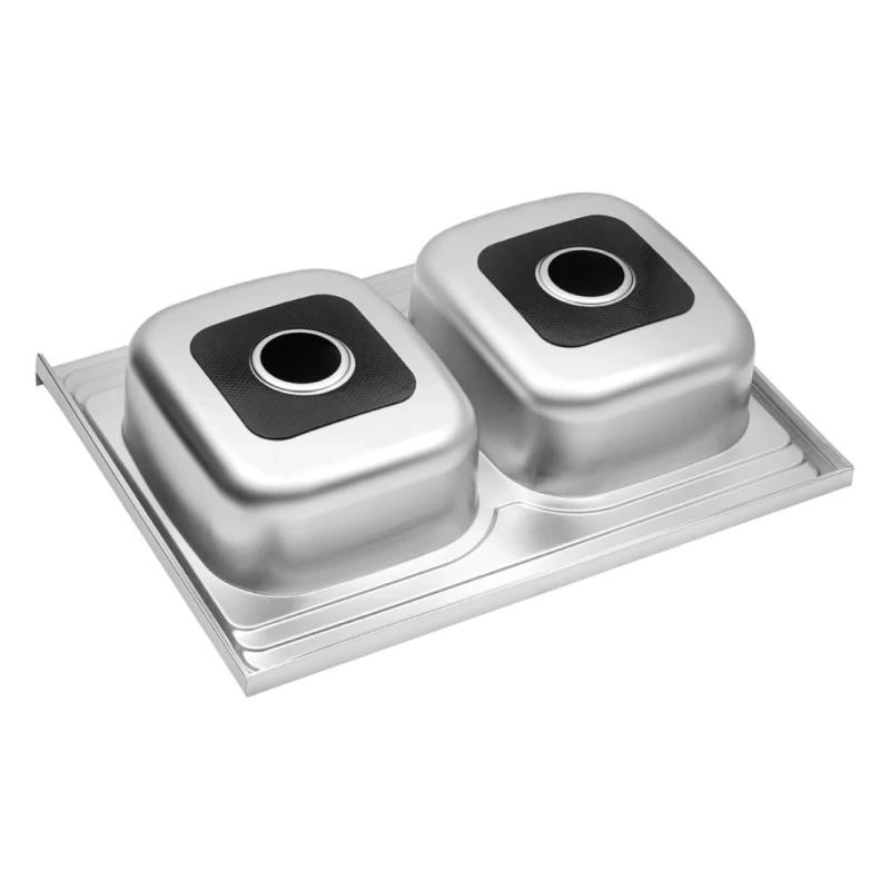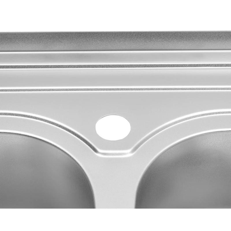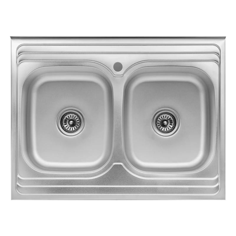 Двойная прямоугольная мойка Kroner KRP Satin-6080Z CV022827 размером 80х60 см изготовлена из нержавеющей стали толщиной 0,8 мм. Мойка накладная и устанавливается с тумбой или на отверстие в столешнице. На дальнем краю предусмотрен бортик для прилегания к стене. Сатиновое покрытие является одним из самых лучших для использования на кухнях: гладкая поверхность не впитывает загрязнениями легко моется, а матовость делает невидимыми засохшие капли воды. Таким образом мойка всегда выглядит чистой и ухоженной с наименьшими усилиями со стороны хозяйки. На борту мойки предусмотрено одно отверстие для смесителя. Благодаря глубине в 18 см и просторным размерам чаши вы легко сможете мыть в ней крупную посуду или набирать воду в высокие кастрюли.