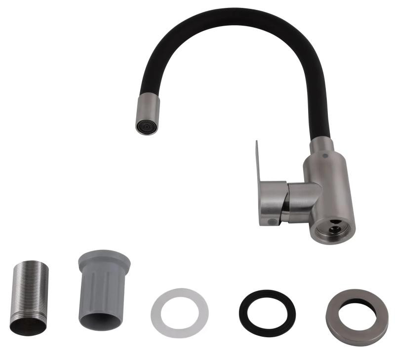 Смеситель для кухни Brinex Pure 015F3 с гибким изливом Nickel/Black – сочетание никелевого корпуса с черным гибким изливом создает современный вид. Функциональный дизайн с возможностью менять направление струи воды. Надежный керамический картридж и качественные материалы обеспечивают долговечность. Комплектация: смеситель, крепления.