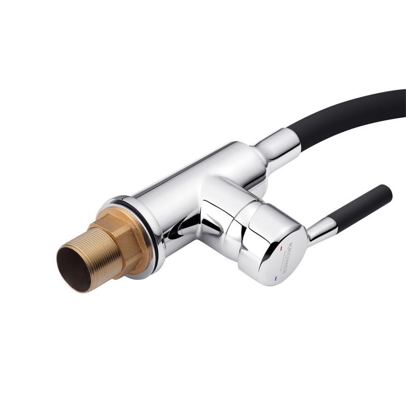 Смеситель имеет врезной тип монтажа с креплением с помощью гайки, что обеспечивает надежность фиксации. Гибкий тип подвода позволяет удобно подключить смеситель к водопроводу. Корпус выполнен в хромированном цвете, а излив в сером, что придает ему элегантный вид. Поверхность корпуса глянцевая, а излив имеет матовое покрытие.