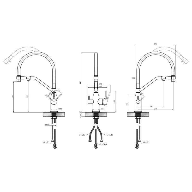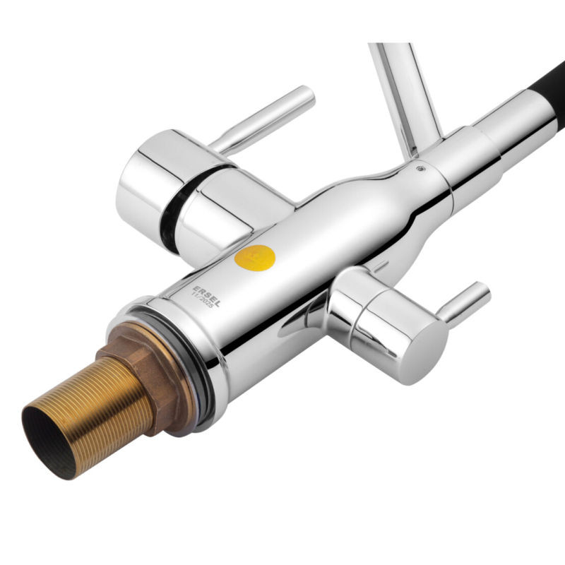 Основные характеристики: латунный корпус, однорычажное управление, гибкий излив, отдельный канал для питьевой воды, монтаж на одно отверстие.
