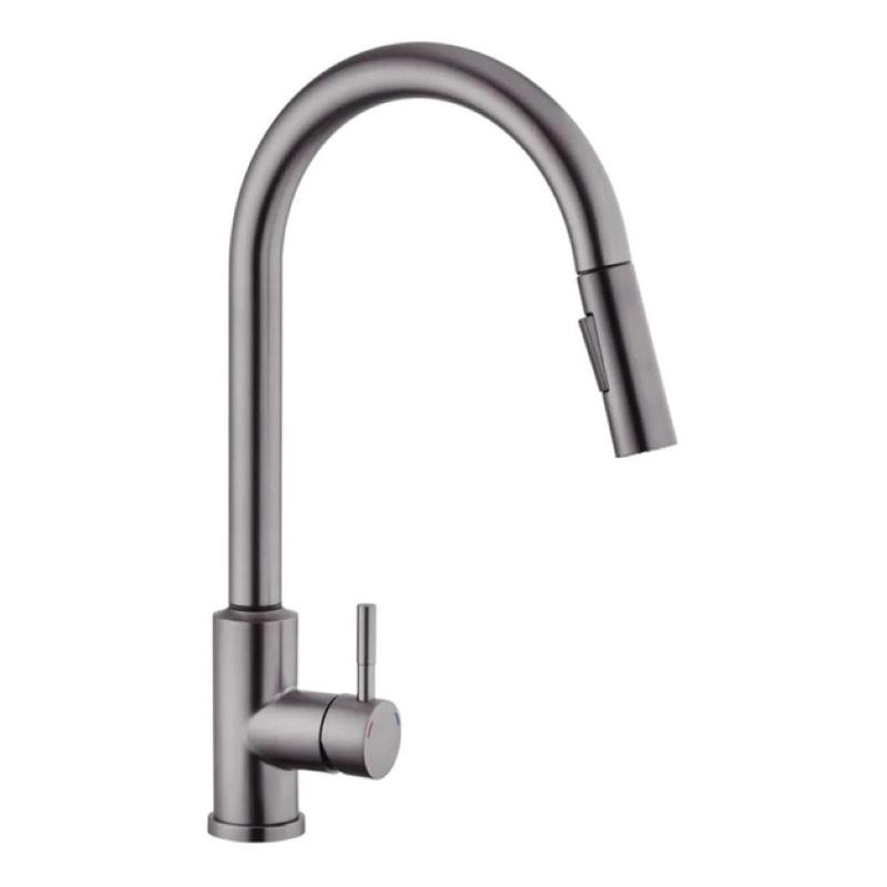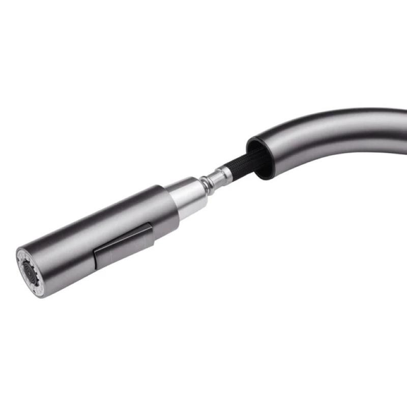 Смеситель имеет лаконичный дизайн и высокую функциональность. Выдвижная лейка снабжена шарниром, обеспечивающим вращение на 360 градусов. Два режима распыления – от потоковой струи без брызг до мощной струи душа – позволяют эффективно выполнять различные задачи, такие как ополаскивание посуды или удаление загрязнений.