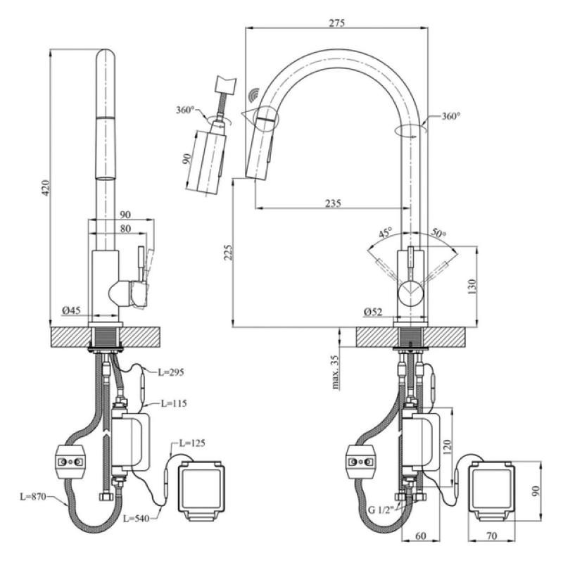 Сенсорный механизм позволяет включать воду, касаясь смесителя тыльной стороной кисти или запястьем, избегая при этом загрязнения поверхности. Эта функция особенно удобна, когда вам нужно вымыть грязные руки, и вы хотите избежать контакта с поверхностью смесителя. Регулировка температуры и напора воды осуществляется поворотом ручки.