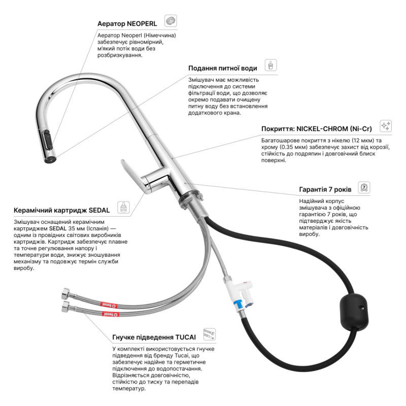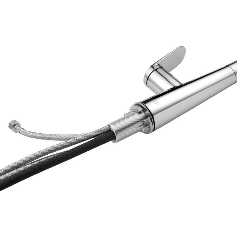 Модель оснащена выдвижным шлангом, который делает повседневные задачи у мойки значительно удобнее — мытьё посуды, наполнение больших ёмкостей и очистка раковины выполняются быстро и без лишних усилий. Практичная кнопка переключения режимов расположена прямо на выдвижной лейке, обеспечивая интуитивное и комфортное управление потоком воды одним нажатием.