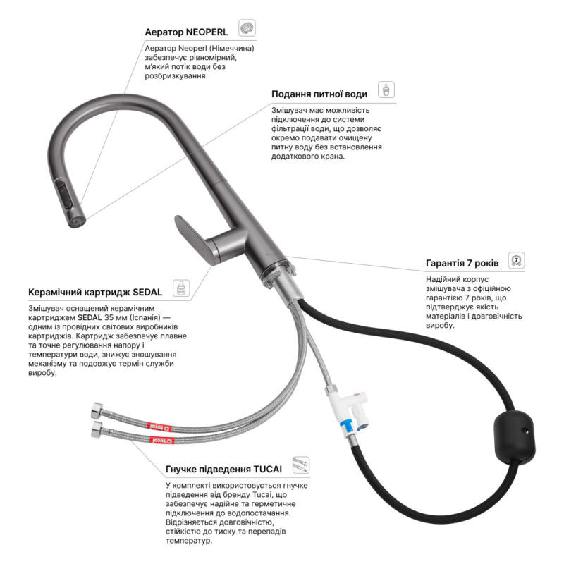 Модель оснащена выдвижным шлангом, что значительно упрощает мытьё посуды, наполнение ёмкостей и уход за мойкой. Особенностью смесителя является удобное управление подачей питьевой воды — кнопка переключения расположена прямо на самой выдвижной лейке, что делает использование максимально интуитивным и комфортным без лишних движений.