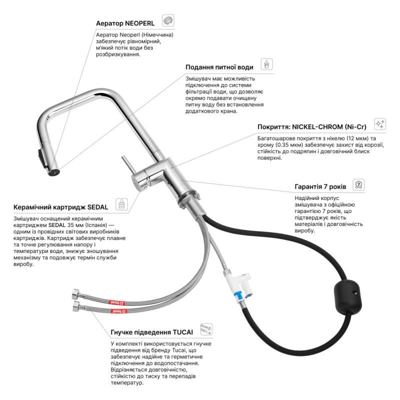 Модель оснащена выдвижным шлангом, который делает повседневные задачи у мойки значительно удобнее — мытьё посуды, наполнение больших ёмкостей и очистка раковины выполняются быстро и без лишних усилий. Практичная кнопка переключения режимов расположена прямо на выдвижной лейке, обеспечивая интуитивное и комфортное управление потоком воды одним нажатием.