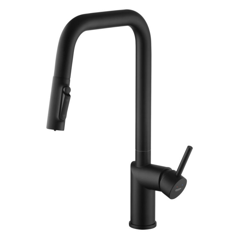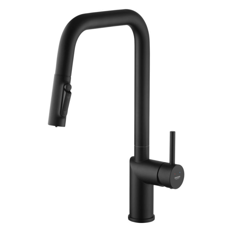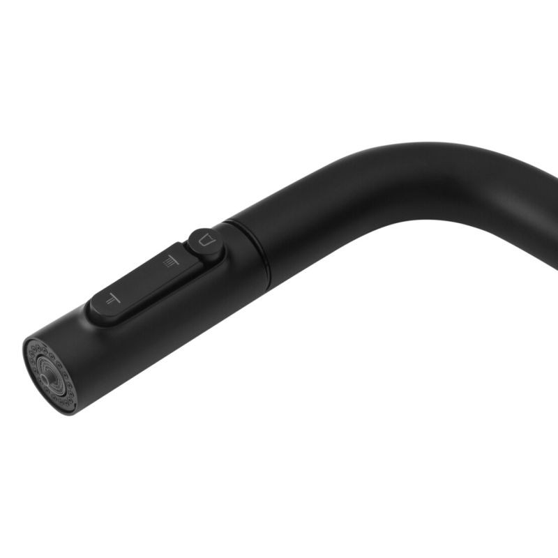 Модель оснащена выдвижным шлангом, что значительно упрощает мытьё посуды, наполнение ёмкостей и уход за мойкой. Особенностью смесителя является удобное управление подачей питьевой воды — кнопка переключения расположена прямо на самой выдвижной лейке, что делает использование максимально интуитивным и комфортным без лишних движений.