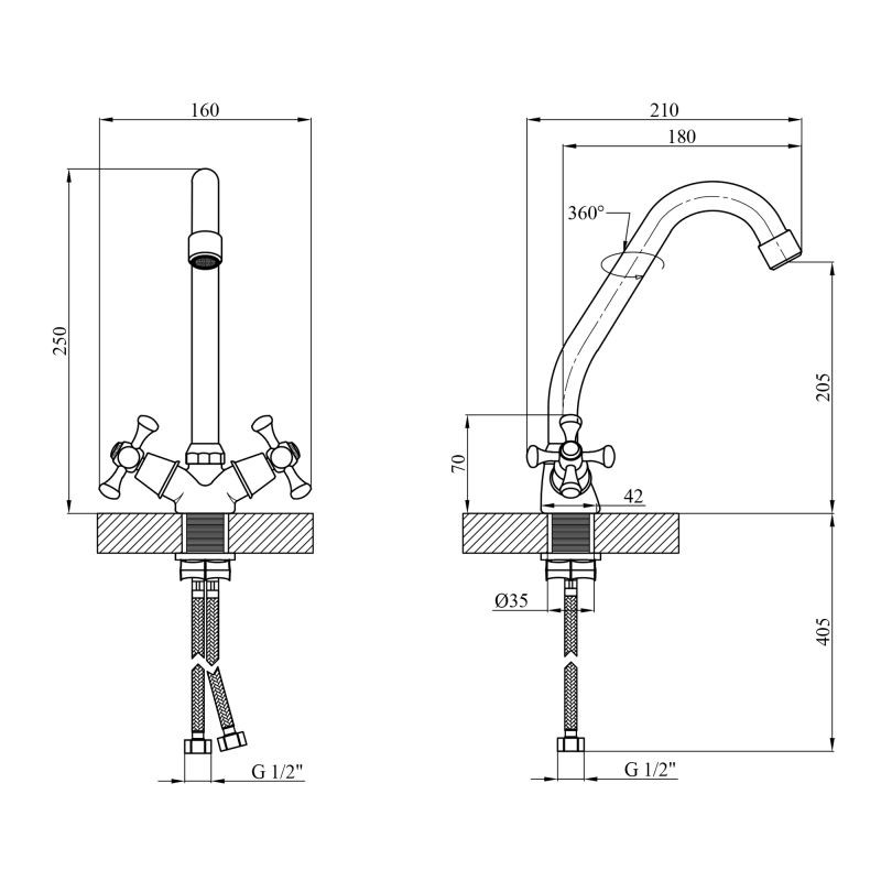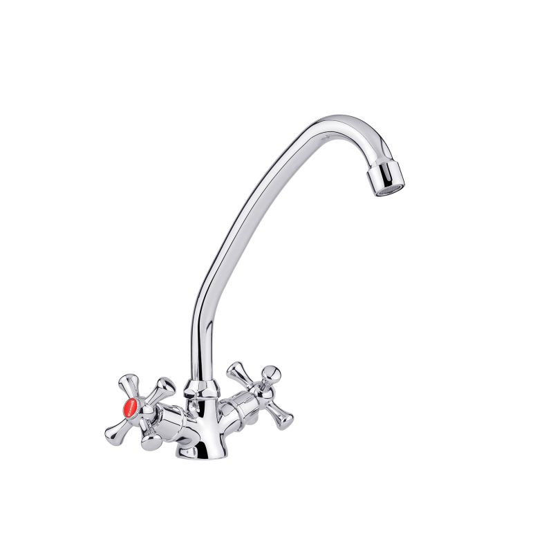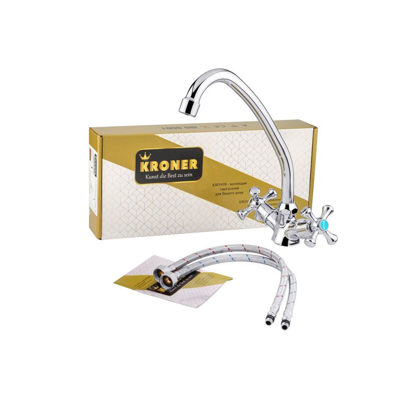 Смеситель для кухни Kroner KRM Rhein-C030 CV014915 изготовлен из силумина и имеет хромированное покрытие. У смесителя есть поворотный высокий излив и классические крестообразные ручки. Благодаря керамическим кран-буксам настройка температуры и напора воды будет лёгкой и быстрой. Смеситель устанавливается на одно отверстие и подключается гибкими шлангами, которые входят в комплект поставки.