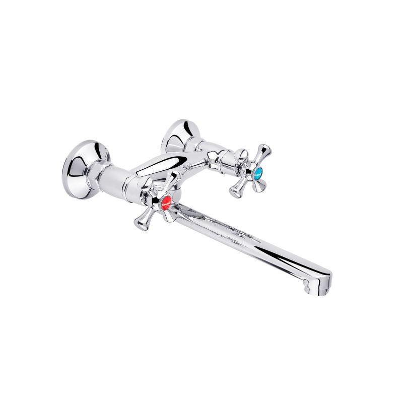 Смеситель для кухни Kroner KRM Rhein-C040 CV014916 изготовлен из силумина и имеет хромированное покрытие. У смесителя есть поворотный длинный излив и классические крестообразные ручки. Благодаря керамическим кран-буксам настройка температуры и напора воды будет лёгкой и быстрой. Смеситель устанавливается на на стену на два отверстия.