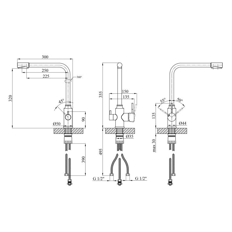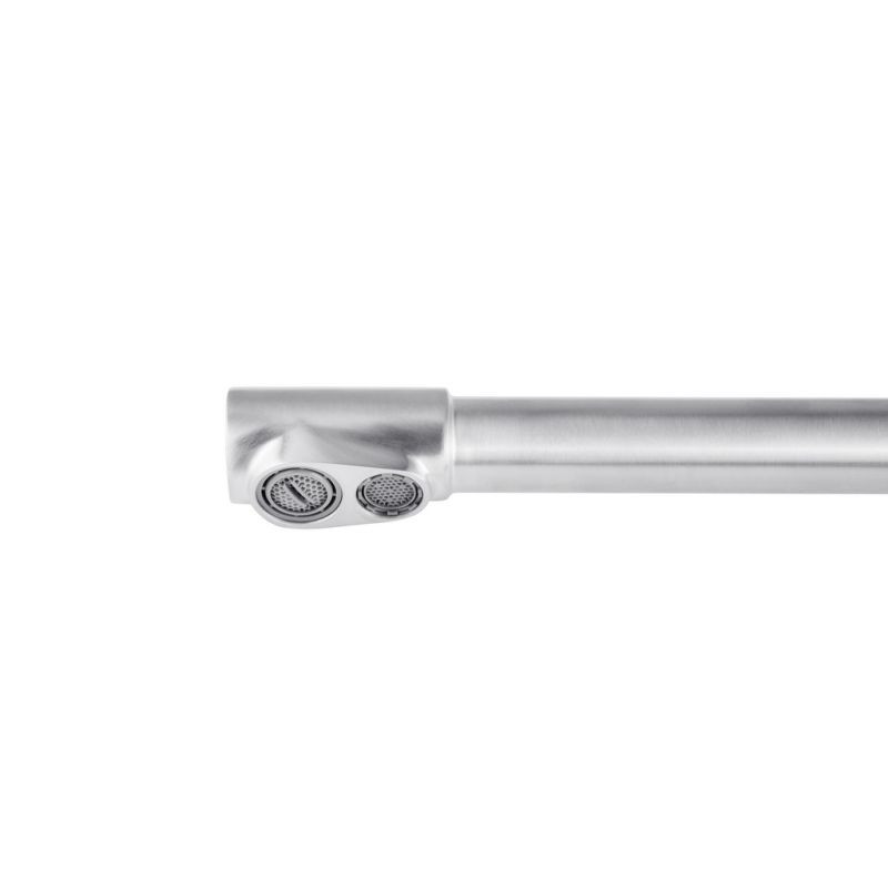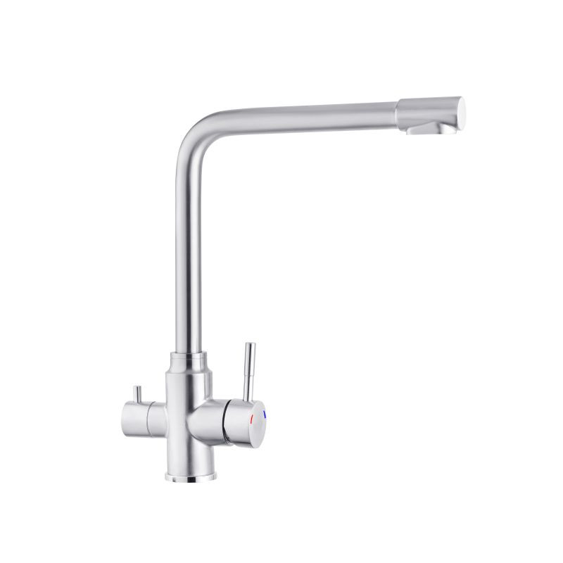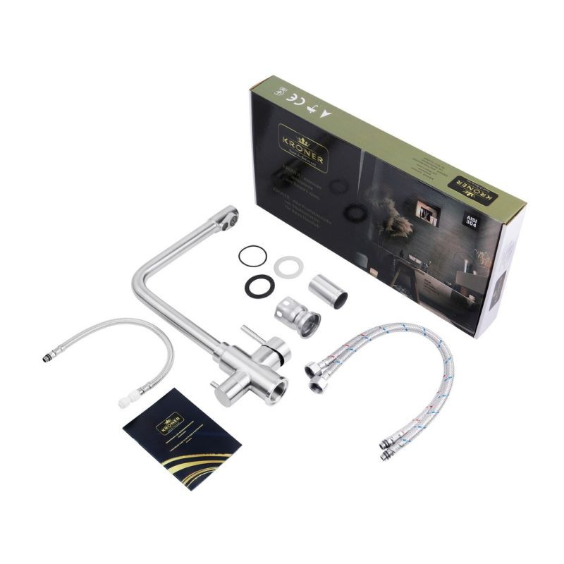 Смеситель для кухни с подключением к фильтру Kroner KRP Edelstahl Klassisch-ESG038 CV022992 с высоким поворотным Г-образным изливом будет великолепным решением для любой современной кухни, так как форма и размеры продуманы таким образом, что вы сможете мыть крупногабаритную посуду, обрабатывать овощи и набирать воду в вазы или высокие кастрюли без каких-либо проблем. Для управление водопроводной водой используется классический рычаг к керамическим картриджем, а для фильтрованной - отдельный вентиль с кран-буксой. Таки смесители экономят пространство с сохранением всех полезных функций. Смеситель устанавливается на одно отверстие и подключается с помощью гибких шлангов, которые входят в комплект поставки.