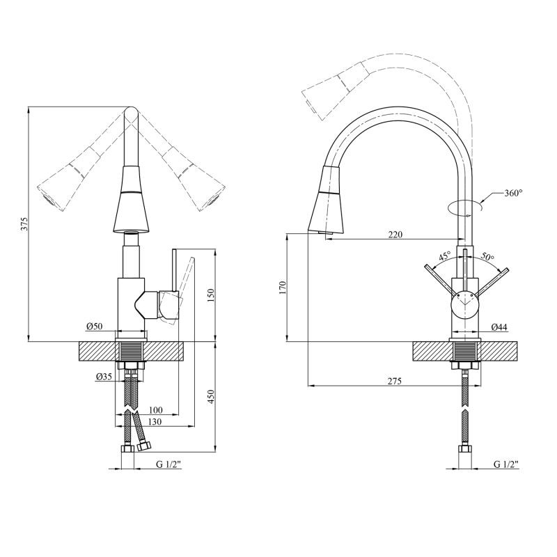 Смеситель для кухни Kroner KRP Kuche-C031RED CV024337 имеет высокий гибкий излив красного матового цвета и хромированный корпус. Смеситель изготовлен из латуни - материала, который является сплавом с содержанием меди, а значит устойчив к коррозии и стойкий к влиянию химических и механических повреждений. Смеситель может подавать два различных потока воды: ламинарная и душевая, переключается поворотом аэратора. Устанавливается смеситель на одно отверстие, а подключается гибкими шлангами, которые входят в комплект поставки.