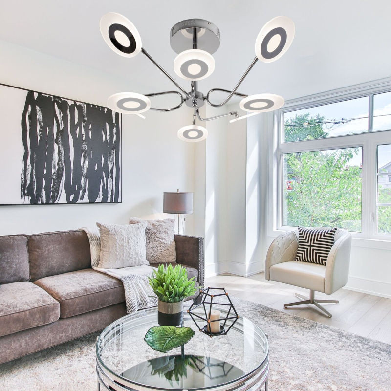 Каркас из металла в хромовом цвете отлично сочетается с 8 круглыми акриловыми плафонами, создавая атмосферу роскоши и элегантности. Встроенные диоды гарантируют не только яркий свет, но и длительную службу, чтобы ваше пространство всегда было наполнено светом.