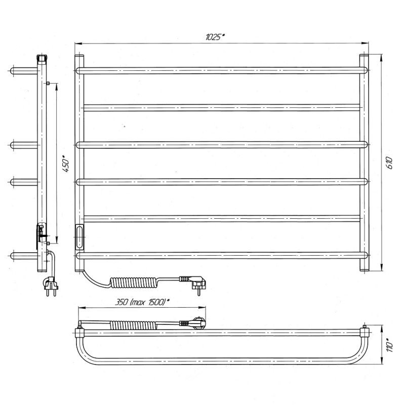 Полотенцесушитель - 1 шт, крепление (шуруп оцинкованный с дюбелем, пластиковое крепление, резьбовая втулка, штифт) - 4 шт, ключ шестигранный - 1 шт, упаковка (короб картонный, чехол полиэтиленовый, чехол полиэтиленовый для крепления, коробочка для креплений) - 1 шт, паспорт - 1 шт.