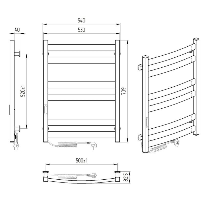 Полотенцесушитель - 1 шт, крепление (шуруп оцинкованный с дюбелем, пластиковое крепление, резьбовая втулка, штифт) - 4 шт, ключ шестигранный - 1 шт, упаковка (короб картонный, чехол полиэтиленовый, чехол полиэтиленовый для крепления, коробочка для креплений) - 1 шт, паспорт - 1 шт.