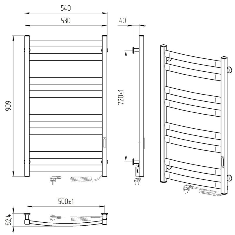 Полотенцесушитель - 1 шт, крепление (шуруп оцинкованный с дюбелем, пластиковое крепление, резьбовая втулка, штифт) - 4 шт, ключ шестигранный - 1 шт, упаковка (короб картонный, чехол полиэтиленовый, чехол полиэтиленовый для крепления, коробочка для креплений) - 1 шт, паспорт - 1 шт.