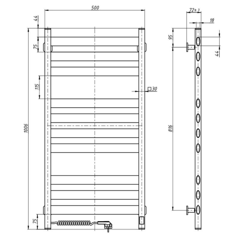 Электрический полотенцесушитель Ellipse имеет коллекторы (стойки), выполненные из профильной квадратной трубы 30х30 мм, а перемычки — из овальных трубок 40х10 мм, что придает ему элегантность и одновременно монументальность формы. Прямые линии в сочетании с овальными перемычками создают модный и оригинальный дизайн.