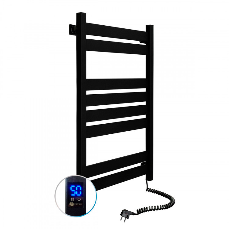 Полотенцесушитель Largo 500х800 Sensor (цвет — черный муар; расположение шнура с вилкой — справа) от украинского производителя NAVIN изготовлен из углеродистой стали, которая отличается высоким качеством и прочностью. Модель имеет надежное порошковое покрытие. Толщина стенок боковых коллекторов (стоек) и перемычек сушилки составляет 1,5 мм.