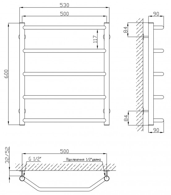 Особенности: Диаметр: стойка d30, толщина 1.5 мм; перемычка d20, толщина 1.5 мм. Максимальная рабочая температура 90 °C, Рабочее давление 15 Атм.