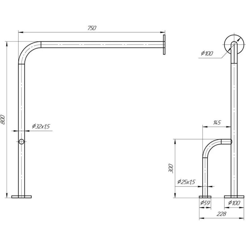 Материал: сталь нержавеющая AISI304, труба Ø32, толщина 1,5 мм, труба Ø25, толщина 1,5 мм, пятак Ø96, толщина 3,0 мм - 2 шт., пятак Ø56, толщина 3,0 мм - 0 . шт., декоративная крышка Ø59, толщина 0,8 мм – 1 шт.
