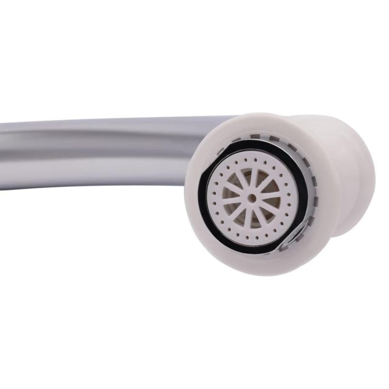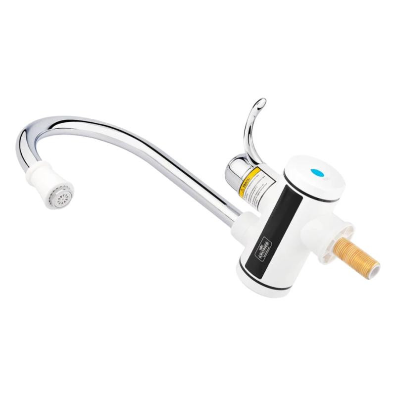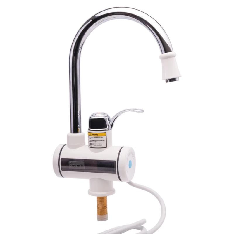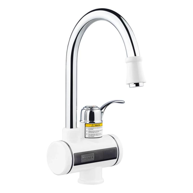 Кран для кухни и раковины с электронагревом Kroner KRM Volt-CW091 CV020401 изготовлен из латуни и ABS-пластика и имеет белый цвет. Смеситель устанавливается на одно отверстие и подключается шлангом к холодной воде (шланг приобретается отдельно). Смеситель оборудован поворотным изливом с аэратором. Также на корпусе есть дисплей, который отображает текущую температуру воды. Данный кран станет идеальным решением для дач, летних домиков или хостелов, где нужна горячая вода.