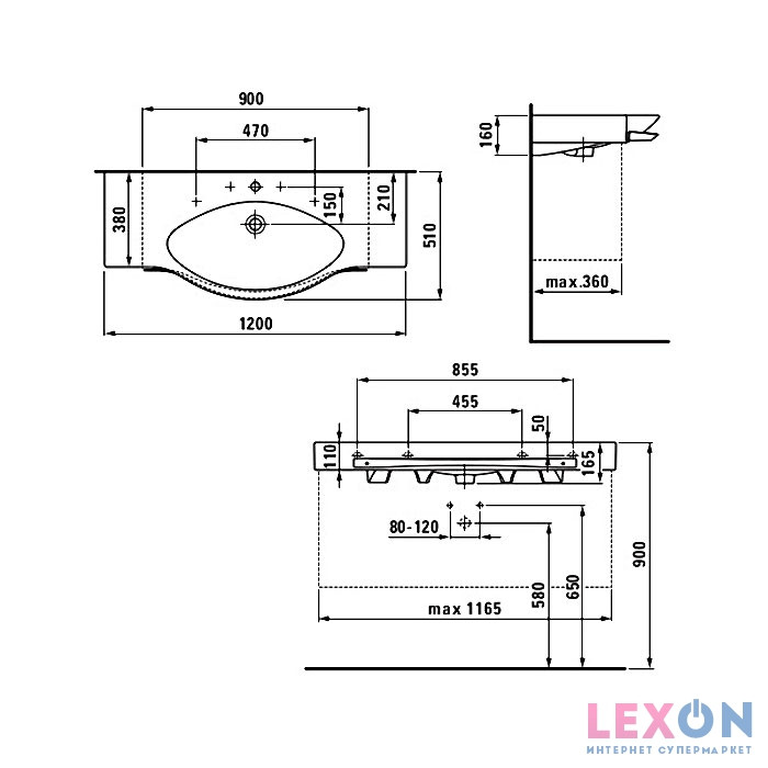 Раковина-столешница, с полотенцедержателем, одно отверстие для смесителя, с переливом, цвет белый 1200x510x165 мм
