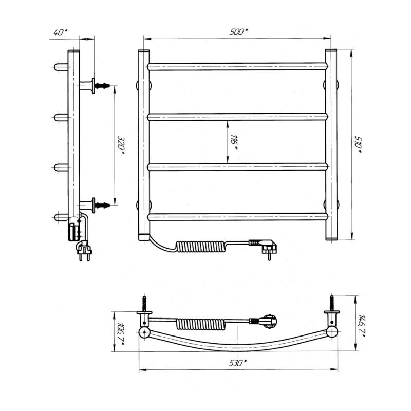 Полотенцесушитель – 1 шт, крепеж (шуруп оцинкованный с дюбелем, пластиковый крепеж, резьбовая втулка, штифт) - 4 шт, ключ шестигранный – 1 шт, упаковка (короб картонный, чехол полиэтиленовый, чехол полиэтиленовый для крепления, короб) , паспорт – 1 шт.