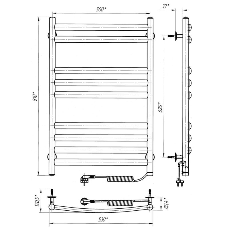 Полотенцесушитель – 1 шт, крепеж (шуруп оцинкованный с дюбелем, пятак, втулка, штифт, стойка) – 4 шт, ключ шестигранный – 1 шт, упаковка (короб картонный, чехол полиэтиленовый, чехол полиэтиленовый для крепления, коробочка.
