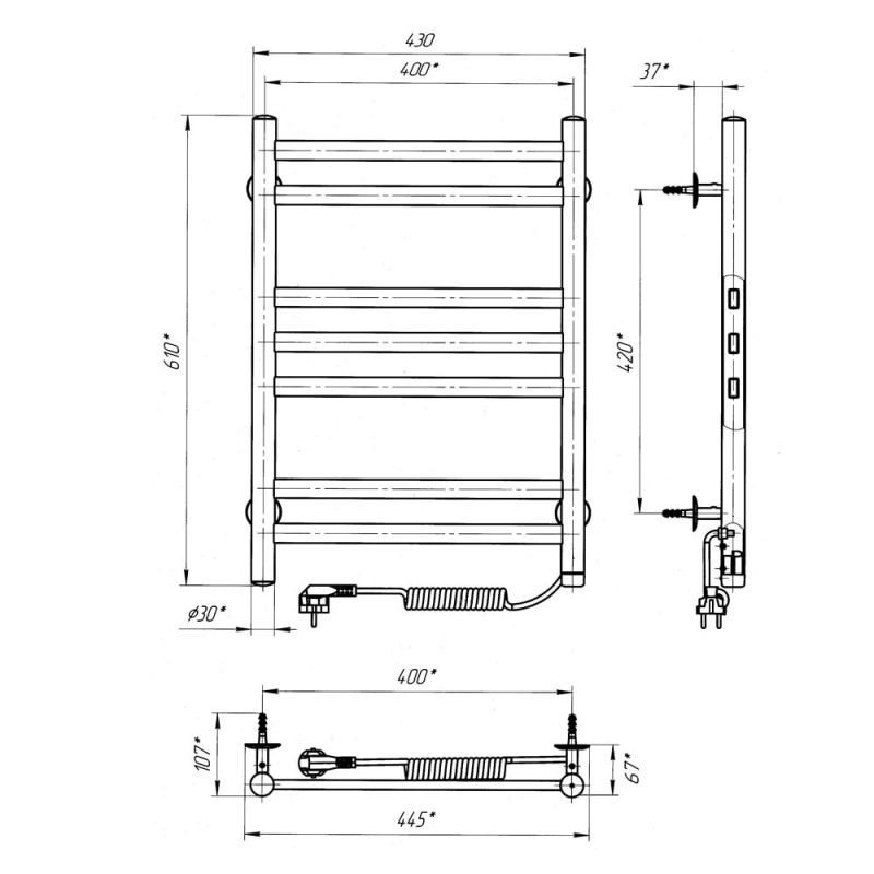 Полотенцесушитель – 1 шт, крепеж (шуруп оцинкованный с дюбелем, пятак, втулка, штифт, стойка) – 4 шт, ключ шестигранный – 1 шт, упаковка (короб картонный, чехол полиэтиленовый, чехол полиэтиленовый для крепления, коробочка.