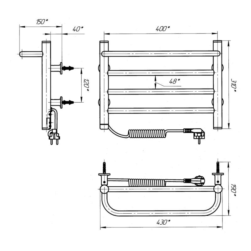 Полотенцесушитель – 1 шт, крепеж (шуруп оцинкованный с дюбелем, пластиковый крепеж, резьбовая втулка, штифт) – 4 шт, ключ шестигранный – 1 шт, упаковка (короб картонный, чехол полиэтиленовый, чехол полиэтиленовый для крепления, короб.