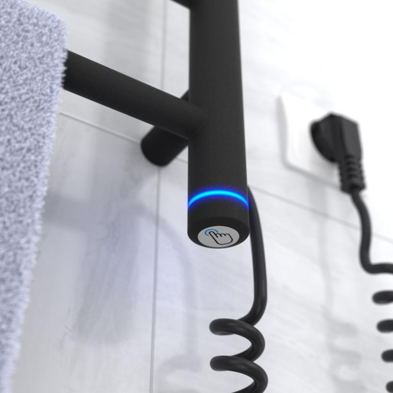При включении полотенцесушителя в электрическую сеть засветится и погаснет подсветка (синий цвет), что сигнализирует об исправности регулятора. Регулятор S3 имеет три режима работы: "min", "mid" и "max". Режимы переключаются кратковременным прикосновением к сенсору (<2 сек) – один за другим по кругу. Сенсор размещается на торце нижней стойки с регулятором.