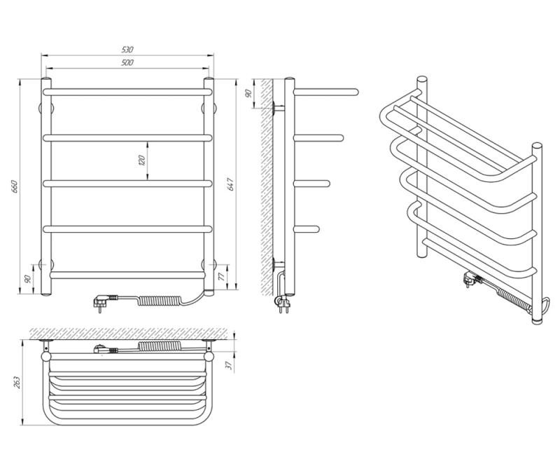 Полотенцесушитель – 1 шт, крепеж (шуруп оцинкованный с дюбелем, пятак, втулка, штифт, стойка) – 4 шт, ключ шестигранный – 1 шт, упаковка (короб картонный, чехол полиэтиленовый, чехол полиэтиленовый для крепления, коробочка.
