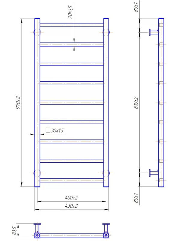 Полотенцесушитель INOX Токио 970×430/400 — практичная и стильная модель для ванной комнаты, изготовленная из высококачественной полированной нержавеющей стали без хромирования. Конструкция имеет размеры: высота — 970 мм, ширина — 430 мм, глубина — 83 мм. Подключение стандартное — G1/2", с возможностью монтажа нижним, диагональным или боковым способом (в одну трубу), в зависимости от особенностей вашей системы отопления.