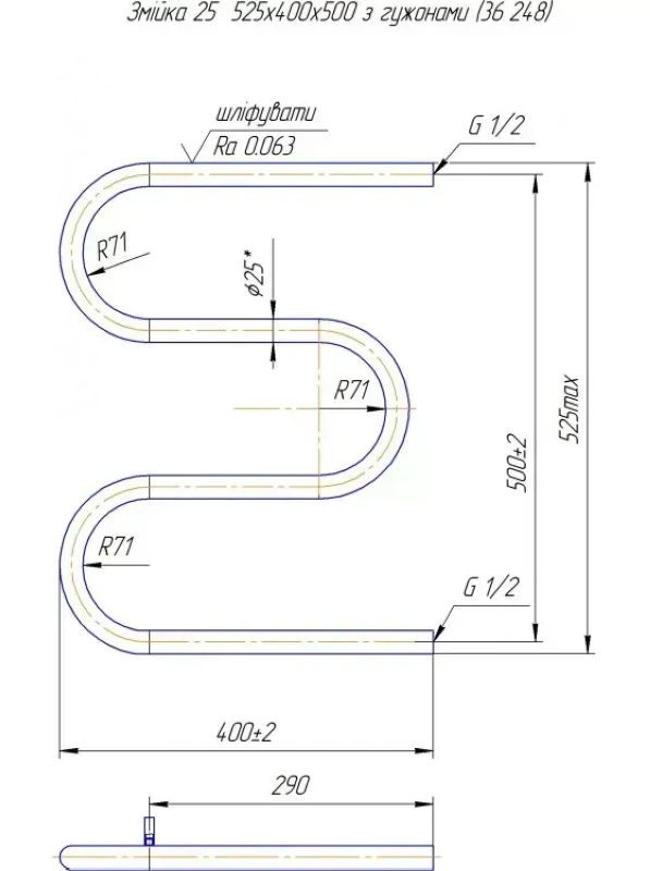 Водяной полотенцесушитель Змейка ∅25 500х400 с межосевым расстоянием для подключения 500мм, диметр подключения G 1/2'' 3 гиба. Полотенцесушитель Змейка 25 с боковым подключением производиться на предприятии Марио с 1998 года