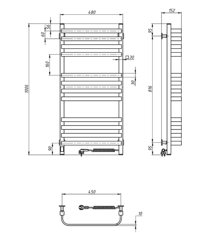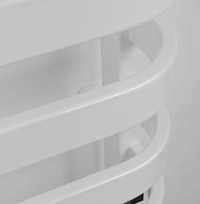 Электрический полотенцесушитель Navin Stugna, коллекторы которого выполнены из профильной квадратной трубы 30х30 мм, а перемычки из прямоугольных изогнутых трубок 30х10мм. Изогнутые и вынесенные на 8 см вперед прямоугольные перемычки повышают конвекционное действие, что повышает функциональность полотенцесушителя Navin Stugna.