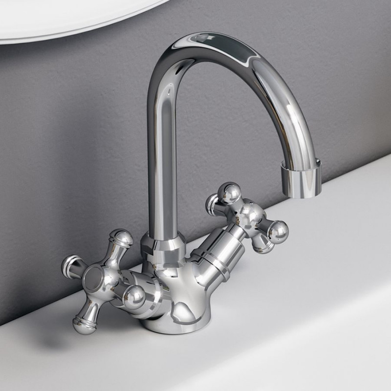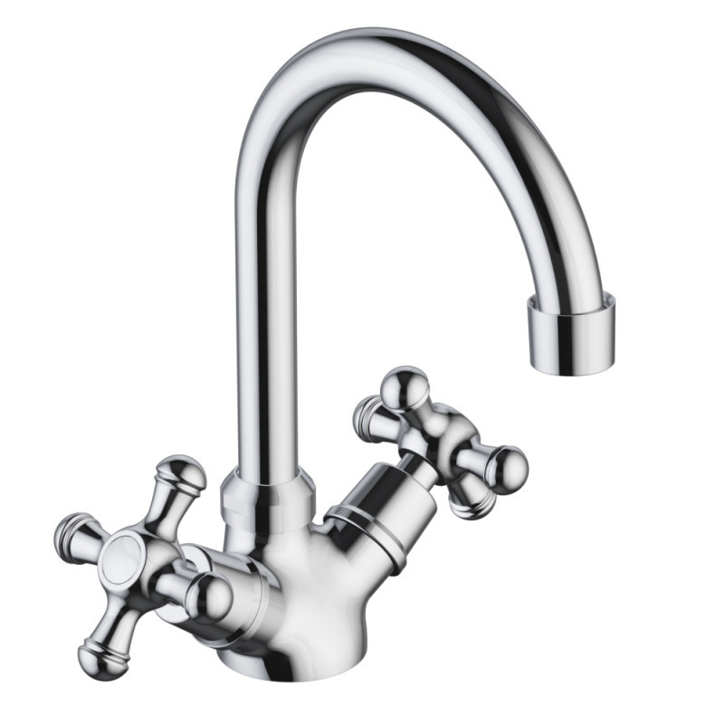 Смеситель для раковины Retro 230210000 от Damixa, изготовлен из высококачественной латуни с хромированным покрытием, имеет стационарный излив с выносом в 11.1 см, и устанавливается на одно отверстие посредством гибкой шланговой подводки с диаметром подключения 3/8".